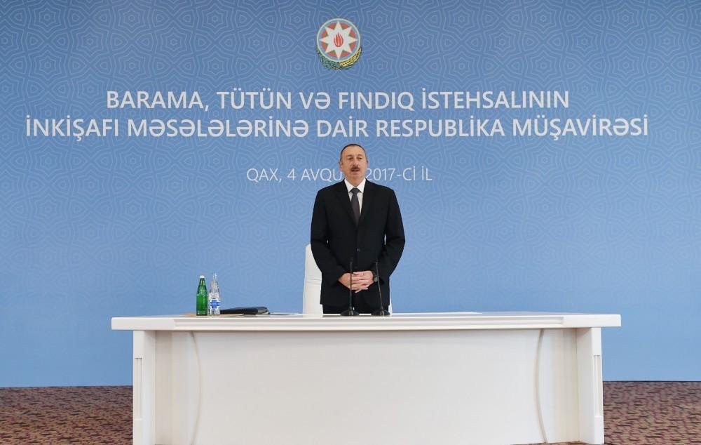 Qaxda Prezident İlham Əliyevin sədrliyi ilə barama, tütün və fındıq istehsalının inkişafı məsələlərinə dair respublika müşavirəsi keçirilib4-08-2017, 11:28