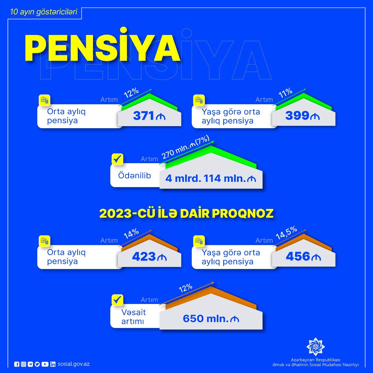 Çap et O cümlədən, yaşa görə pensiyaların orta aylıq məbləği 11 faiz artaraq 399 manat təşkil edib. 2022-ci ilin 10 ayında pensiyaların ödənişinə yönəldilən vəsaitin həcmi 7 faiz və ya 270 mln. manat artaraq 4 mlrd. 114 mln. manat olub. Yeni qanun layihəsinə əsasən, gələn il üzrə pensiyaların ödənişi üçün ayrılan vəsaitin bu ilkinə nisbətən 650 milyon manat və ya 12 faiz çox olacağı gözlənilir. Gələn il pensiyaların orta aylıq məbləğinin bu ilkindən 14 faiz çox olmaqla 423 manat, yaşa görə pensiyaların orta aylıq məbləğinin isə bu ilkindən 14,5 faiz çox olmaqla 456 manat olacağı proqnozlaşdırılır. Reytinq: