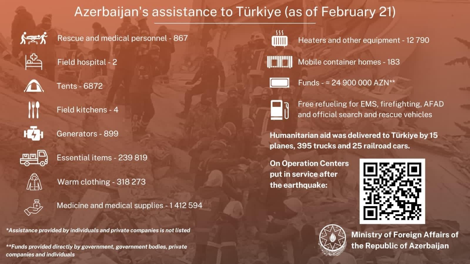 Çap et Bu barədə Azərbaycan Xarici İşlər Nazirliyi tviter hesabında paylaşım edib. Humanitar yardım Türkiyəyə 15 təyyarə, 395 yük avtomobili və 25 qatar vaqonu vasitəsilə çatdırılıb. Xatırladaq ki, fevralın 6-da Türkiyədə səhər saatlarında 7.7 və 7.6 bal gücündə iki zəlzələ baş verib. Dərinliyi 7 kilometr olduğu müəyyən edilən zəlzələ Hatay, Qaziantep, Kilis, Osmaniye, Malatya, Adıyaman, Şanlıurfa, Diyarbəkir, Adana və Kahramanmaraş vilayətlərində ciddi dağıntılara səbəb olub. Humanitar yardımla bağlı infoqrafika: Reytinq: